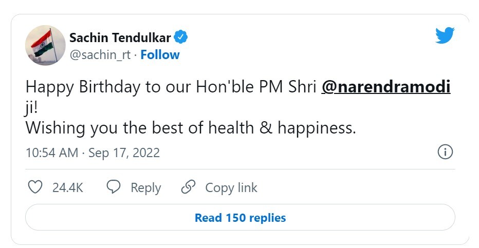 भारत रत्न से सम्मानित दिग्गज क्रिकेटर सचिन तेंदुलकर ने बधाई देते हुए लिखा, ‘हमारे माननीय प्रधानमंत्री जी को को जन्मदिन की शुभकामनाएं, आपके अच्छे स्वास्थ्य और खुशी की कामना.’