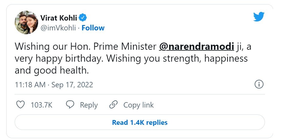 टीम इंडिया के पूर्व कप्तान विराट कोहली ने भी ट्वीट में प्रधानमंत्री मोदी को जन्मदिन की बधाई देते हुए उनके खुशी और अच्छे स्वास्थ्य की कामना की.