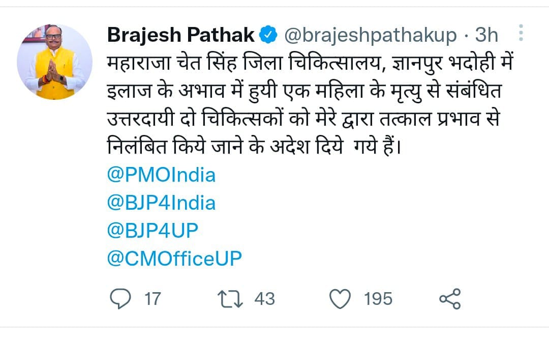 ट्वीट में कहा गया कि महिला के उपचार में लापरवाही बरतने पर दो चिकित्सकों को निलंबित किया गया। इसी तरह महाराजा बलवंत सिंह अस्पताल भदोही के एक सरकारी चिकित्सक के प्राइवेट प्रैक्टिस के मामले में जांच कर रिपोर्ट दो दिनों में मांगी है।