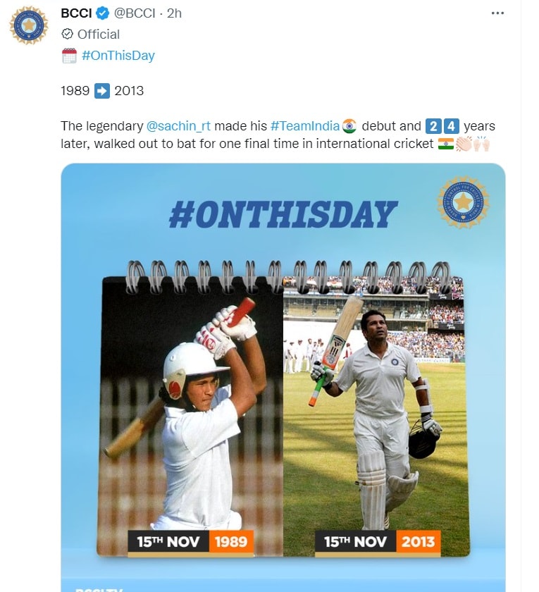 इसी टेस्ट के दूसरे दिन यानी 15 नवंबर को सचिन आखिरी बार इंटरनेशनल क्रिकेट में बल्लेबाजी के लिए उतरे थे. उन्होंने अपनी आखिरी पारी में 74 रन बनाए थे. BCCI ने भी उनके संन्यास को डेब्यू की तारीख से जोड़ते हुए ट्वीट शेयर किया है.