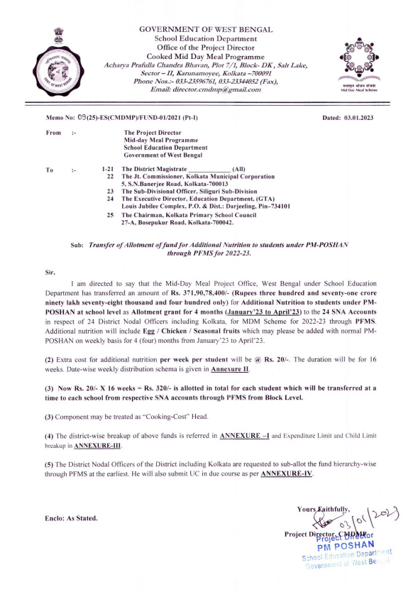 स्कूल विभाग के एक अधिकारी ने कहा कि अप्रैल के बाद यह प्रावधान जारी रहेगा या नहीं, इस फैसला बाद में किया जाएगा। तीन जनवरी की जारी हुई अधिसूचना की मानें तो प्रत्येक छात्र को अतिरिक्त पोषण प्रदान करने पर प्रति सप्ताह 20 रुपये की राशि खर्च की जाएगी। यह प्रक्रिया 16 सप्ताह तक चलेगी। राज्य द्वारा संचालित और सहायता प्राप्त स्कूलों में 1.16 करोड़ से अधिक छात्र मध्याह्न भोजन योजना का लाभ उठाते हैं। इस पर होने वाला 60 फीसदी खर्च राज्य सरकार और बाकी 40 फीसदी केंद्र सरकार सरकार उठाती है।