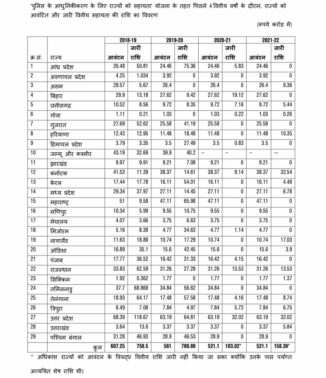 ‘पुलिस के आधुनिकीकरण के लिए राज्यों को सहायता’, योजना के तहत गत चार वर्ष के दौरान आवंटित और जारी राशि में काफी उतार चढ़ाव देखने को मिला है। अनेक राज्य ऐसे हैं जो आवंटन राशि को तय समय पर खर्च नहीं कर पा रहे हैं। नतीजा, आगामी वर्ष के लिए संबंधित राज्य को केंद्र द्वारा जो राशि आवंटित होती है, उसमें कटौती हो जाती है। राज्यों को 2018-19 में 607.25 करोड़ रुपये आवंटित हुए, जबकि 758.5 करोड़ रुपये जारी किए गए। 2019-20 में आवंटित राशि 561 करोड़ रुपये और जारी हुई राशि 780.89 करोड़ रुपये थी। 2020-21 में 521.1 करोड़ रुपयों के आवंटन के मुकाबले जारी हुई राशि 103.02 करोड़ रुपये रही थी। इस वर्ष अधिकांश राज्यों को आवंटन के विरुद्ध वित्तीय राशि इसलिए जारी नहीं की जा सकी, क्योंकि उनके पास पर्याप्त अव्ययित शेष राशि थी। अगले वर्ष भी 521.1 करोड़ रुपयों का आवंटन हुआ, जबकि जारी हुई राशि 158.39 करोड़ रुपये थी।