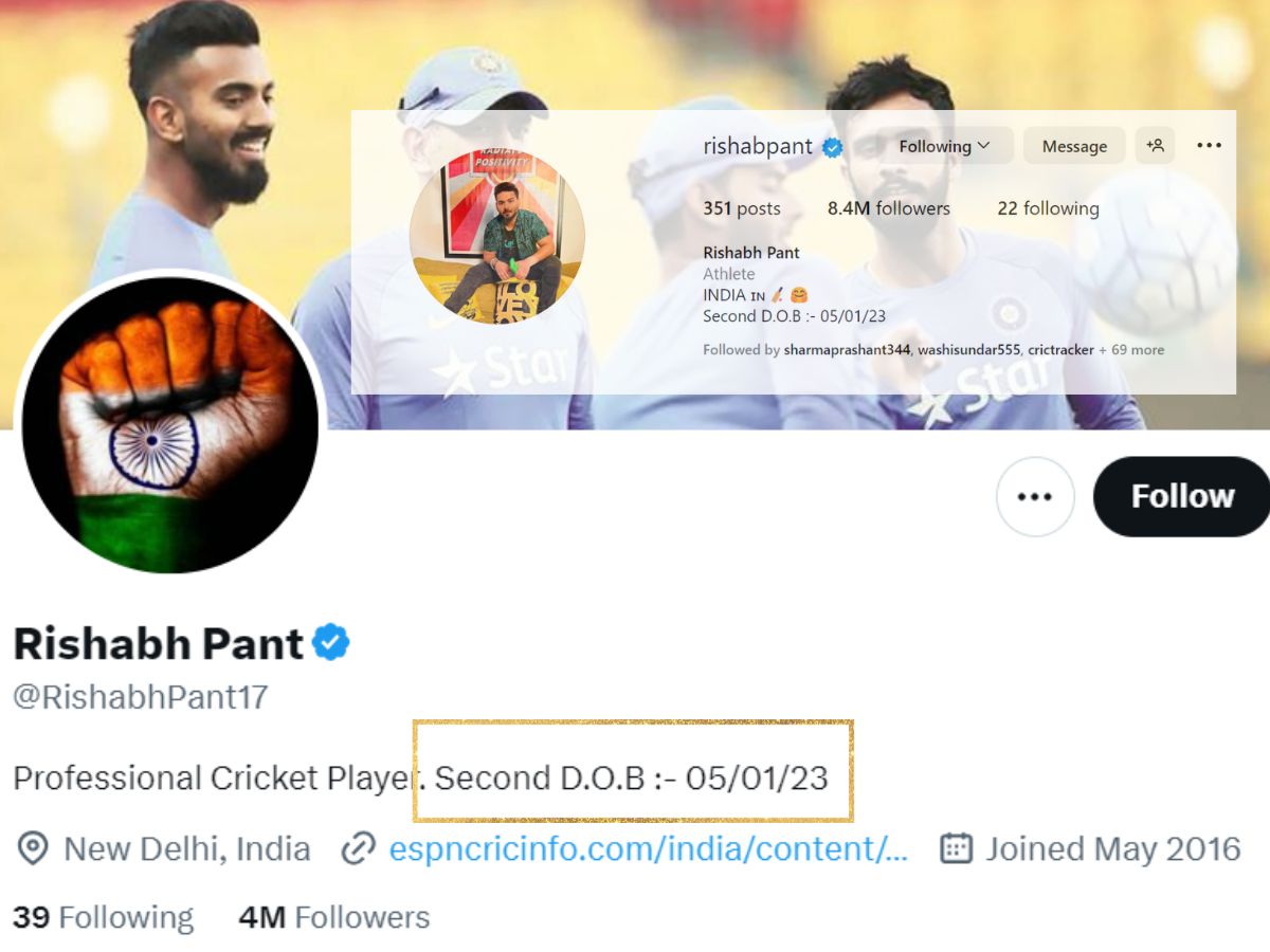 भारतीय क्रिकेट टीम के स्टार प्लेयर ऋषभ पंत (Rishabh Pant) का जन्म 4 अक्टूबर 1997 को उत्तराखंड के रुड़की में हुआ था. ऋषभ पंत (Rishabh Pant) 30 दिसंबर 2022 को कार एक्सीडेंट (Rishabh Pant Accident) में गंभीर रूप से चोटिल हुए थे. ऐसे में उन्होंने अब सभी सोशल मीडिया प्लेटफॉर्म के बायो में अपने जन्म की तारीख बदल ली है. ऋषभ पंत (Rishabh Pant) ने सोशल मीडिया प्लेटफॉर्म्स के बायो में बदलाव करते हुए लिखा, ‘दूसरी जन्म तारीख- 1 जनवरी 2023.’