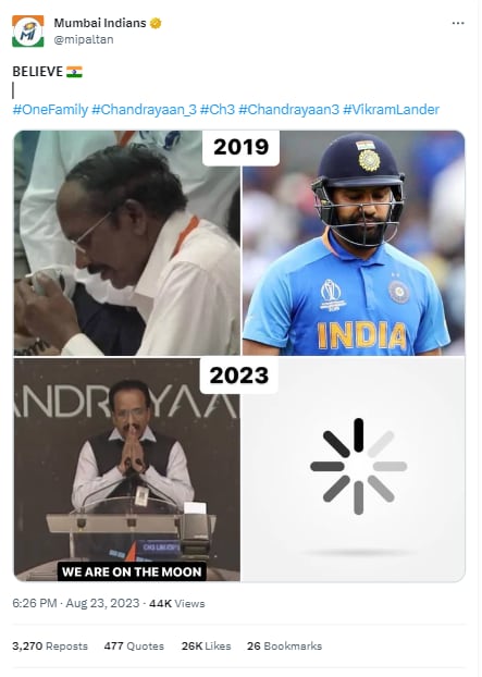 विक्रम लैंडर के सफल लैंडिंग के बाद आईपीएल फ्रेंचाइजी मुंबई इंडियंस ने एक बेहद दिलचस्प तस्वीर साझा की है. एमआई ने साल 2019 के चंद्रयान-2 के साथ रोहित शर्मा की तस्वीर साझा की है. जब करोड़ों लोगों का दिल टूटा था.