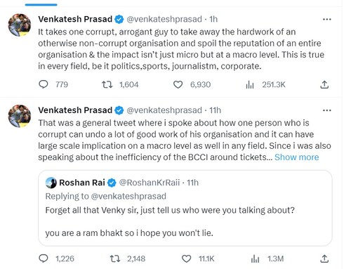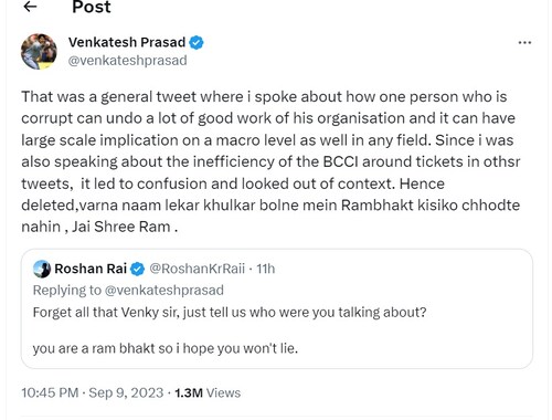 वेंकटेश ने अपनी इस पोस्ट में किसी संस्था या व्यक्ति का नाम तो नहीं लिखा लेकिन इसे बीसीसीआई से जोड़ा जाने लगा. क्योंकि वेंकटेश ने हाल ही में वर्ल्ड कप की टिकट बिक्री को लेकर सवाल खड़े किए थे. इसी पोस्ट को जब उन्होंने एक दिन पहले एक्स पर से डिलीट कर दिया था तो एक यूजर ने वेंकटेश से इसे डिलीट करने की वजह पूछी थी. इस पर वेंकटेश ने अपना जवाब दिया था.