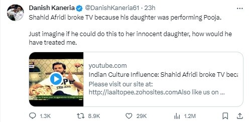 दानिश कनेरिया ने इसी वीडियो के जरिए अफरीदी पर गंभीर आरोप लगाए. उन्होंने ट्विटर पर वीडियो पोस्ट करते हुए कैप्शन में लिखा,” शाहिद अफरीदी ने टीवी तोड़ दिया क्योंकि उसकी बेटी पूजा कर रही थी. आप सोच सकते हो कि वो जब इस तरह की चीजें अपनी बेटी के साथ कर सकते हैं तो उन्होंने मेरे साथ कैसा व्यवहार किया होगा.”