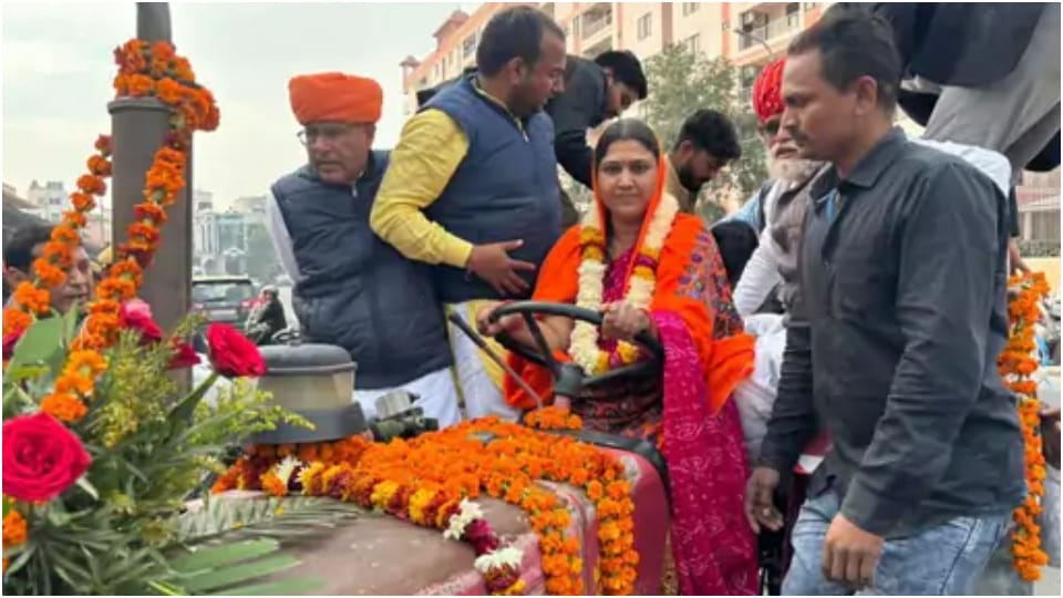 भरतपुर की बयाना सीट से निर्दलीय चुनाव जीतकर विधायक बनी रितु बनावत ट्रैक्टर से सदन पहुंचीं। इस दौरान उनके साथ कई समर्थक भी ट्रैक्टर पर सवार थे।