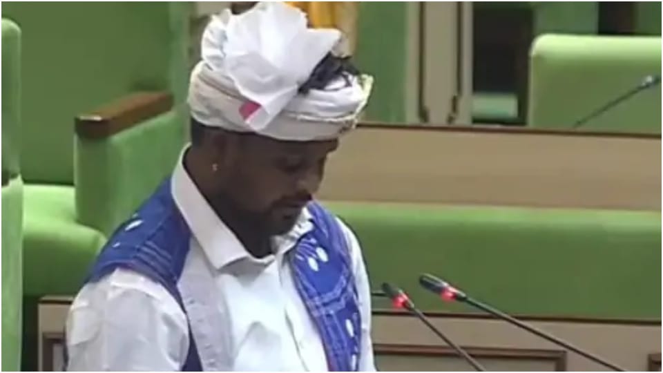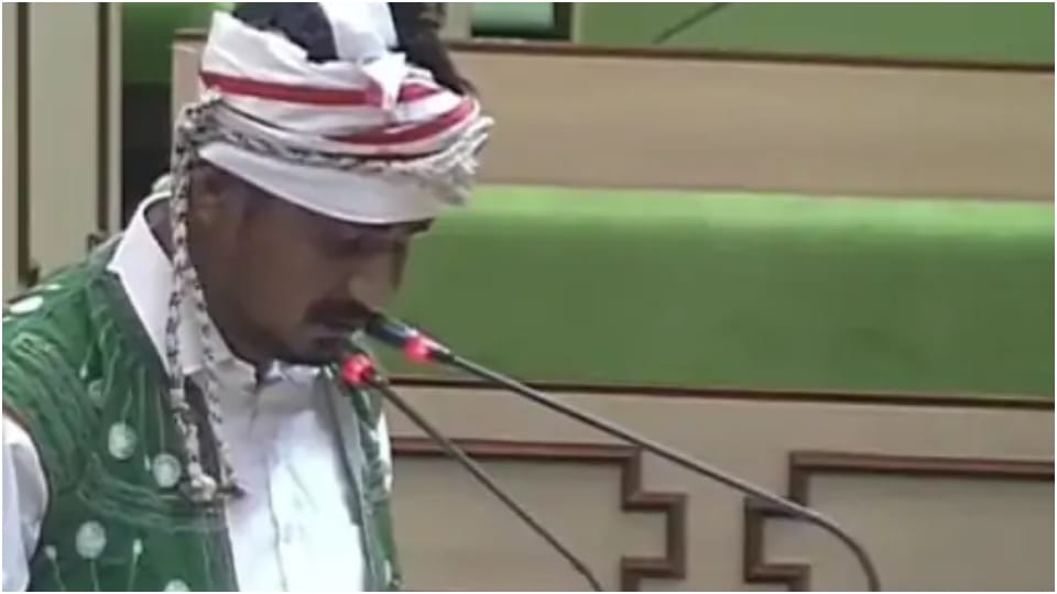 डूंगरपुर की आसपुर सीट से चुनाव जीतकर विधायक बने भारत आदिवासी पार्टी (बाप) के उमेश मीणा डामोर ने आदिवासी वेशभूषा में शपथ ली।